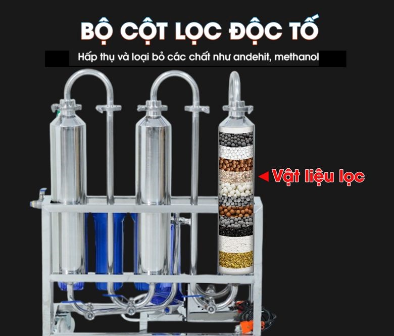 Đây chính là “trái tim” của máy, được thiết kế với đường kính rộng hơn so với cột lọc cũ (76mm). Bên trong các cột lọc là nhiều lớp vật liệu được sắp xếp theo tầng, có tác dụng loại bỏ hiệu quả những độc tố nguy hiểm như andehit, methanol, furfurol – các chất thường gây đau đầu, chóng mặt và mệt mỏi sau khi uống. Nhờ vậy, rượu sau lọc trở nên êm dịu hơn, an toàn hơn và dễ uống hơn.