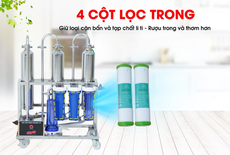 - Sau khi được lọc ở cột lọc inox, rượu sẽ qua các cột lọc trong giúp rượu uống trong hơn. Thời gian bơm hút đầy qua các cột lọc chỉ mất từ 10 – 15 phút. Vừa nhanh chóng vừa tiết kiệm điện năng.