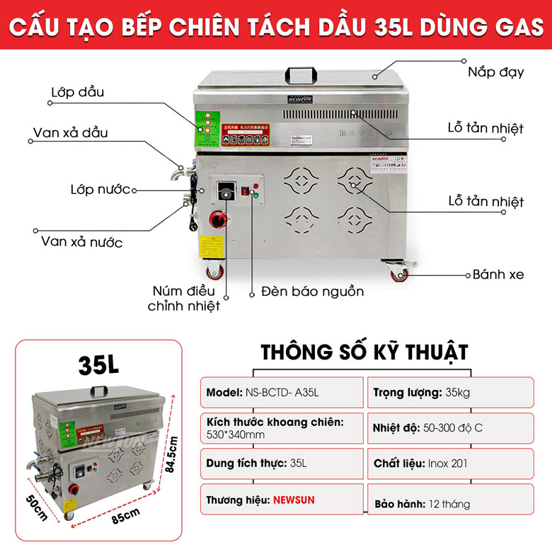 Ưu điểm nổi bật trong thiết kế của bếp chiên tách dầu 35L dùng gas NEWSUN