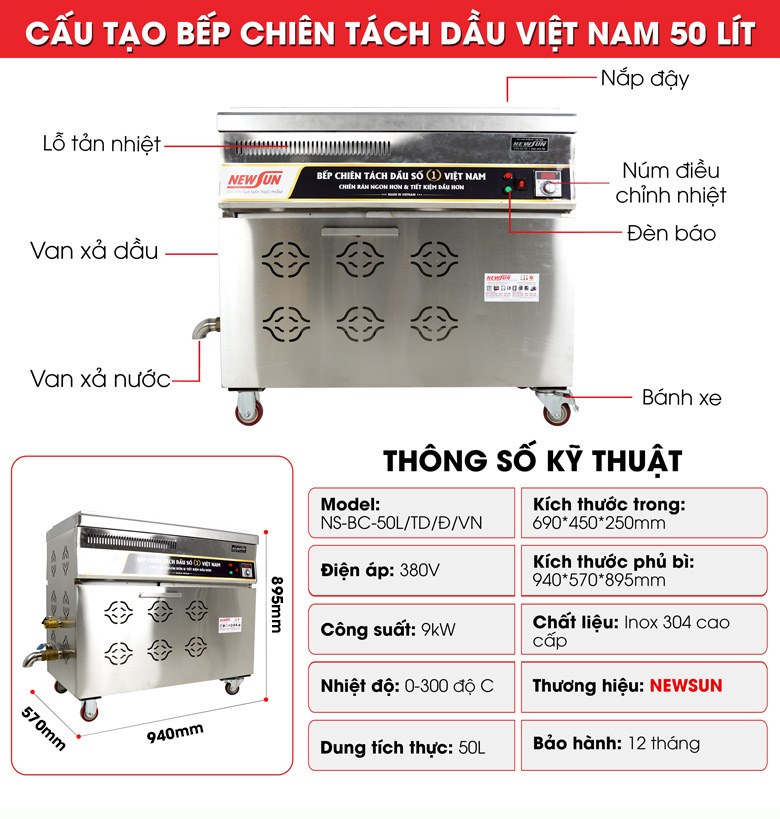 Bếp chiên tách dầu Việt Nam 50 lít được NEWSUN nghiên cứu sở hữu công nghệ chiên mới và cải tiến về chất liệu inox 304, mang đến lựa chọn hoàn hảo cho các nhà hàng, quán ăn quy mô công nghiệp. Không chỉ cho thành phẩm chín đều, thơm ngon, thiết bị còn giúp tiết kiệm tối đa thời gian và chi phí dầu chiên.