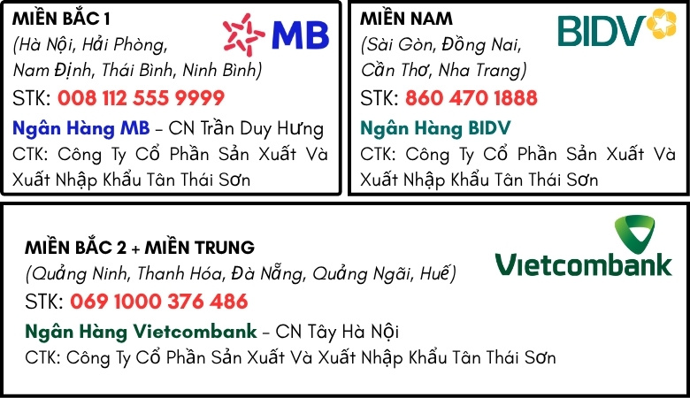 Trong quá trình đặt hàng, sẽ xác nhận với quý khách qua email hoặc tin nhắn điện thoại thông tin số tài khoản của công ty.