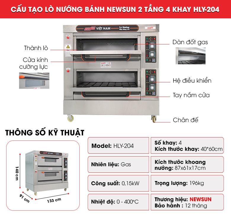 Lò nướng bánh 2 tầng 4 khay HLY-204 (Gas) là mẫu sản phẩm mới, được NEWSUN nhập khẩu và phân phối trực tiếp đến tay khách hàng không qua trung gian nên được đảm bảo cả về chất lượng lẫn giá thành.