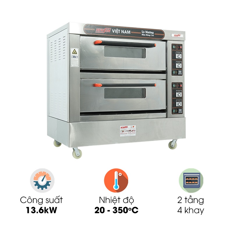 Lò nướng bánh 2 tầng 4 khay XYF-1KA-T NEWSUN vận hành với công suất 13,6kW gia nhiệt thần tốc. Kết hợp với đó là 2 giàn nhiệt trên và dưới giúp nướng bánh chín đều từ trong ra ngoài, từ trên xuống dưới. Bạn có thể nướng tất cả các loại thực phẩm và bánh ngọt mà không cần lật trở.