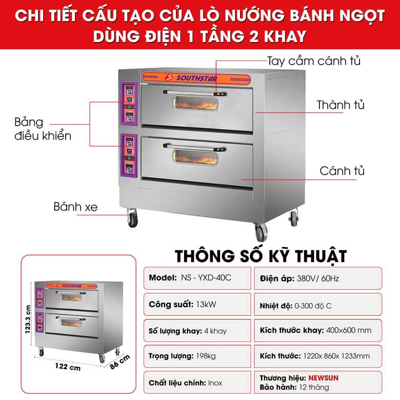 Ngược lại, lò nướng bánh ngọt dùng điện 2 tầng 4 khay Southstar được thiết kế chuyên dụng để nướng bánh nên có thể khắc phục được tất cả những nhược điểm trên: