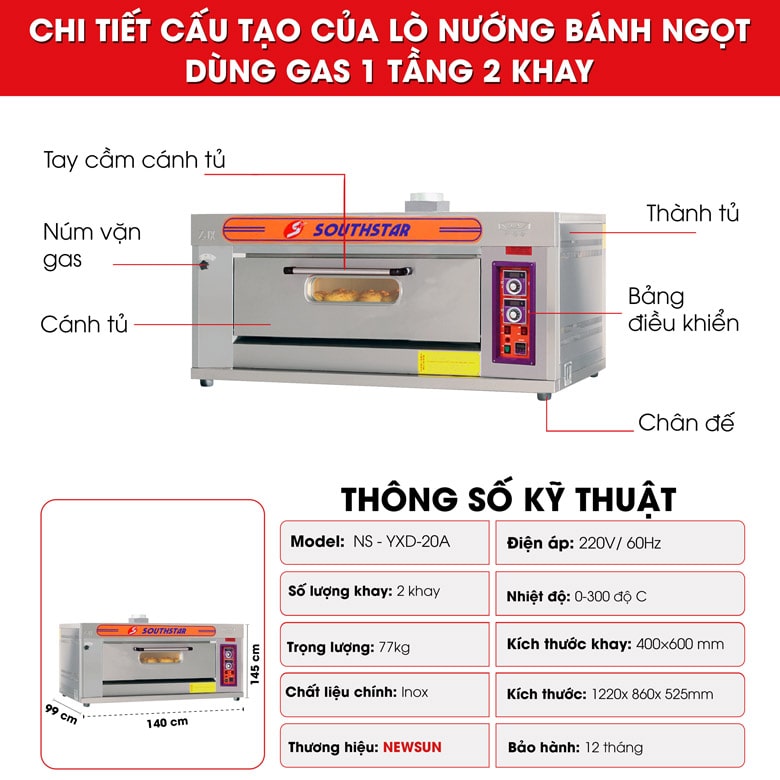 Điểm đặc biệt trong thiết kế của lò nướng bánh ngọt dùng gas 1 tầng 2 khay Southstar