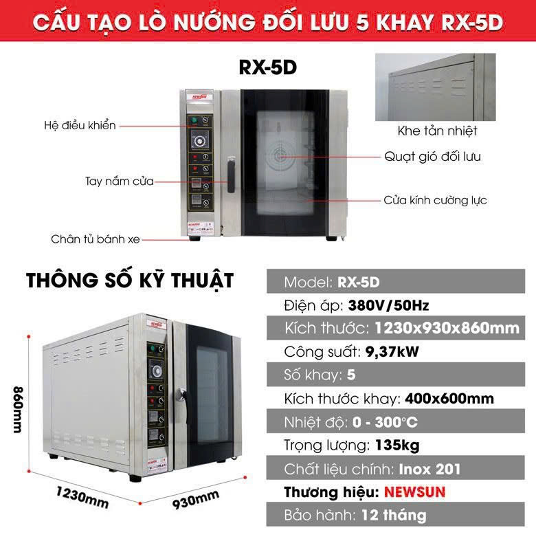 Lò nướng đối lưu 5 khay RX-5D là mẫu sản phẩm mới, được NEWSUN nhập khẩu và phân phối trực tiếp đến tay khách hàng không qua trung gian nên được đảm bảo cả về chất lượng lẫn giá thành.