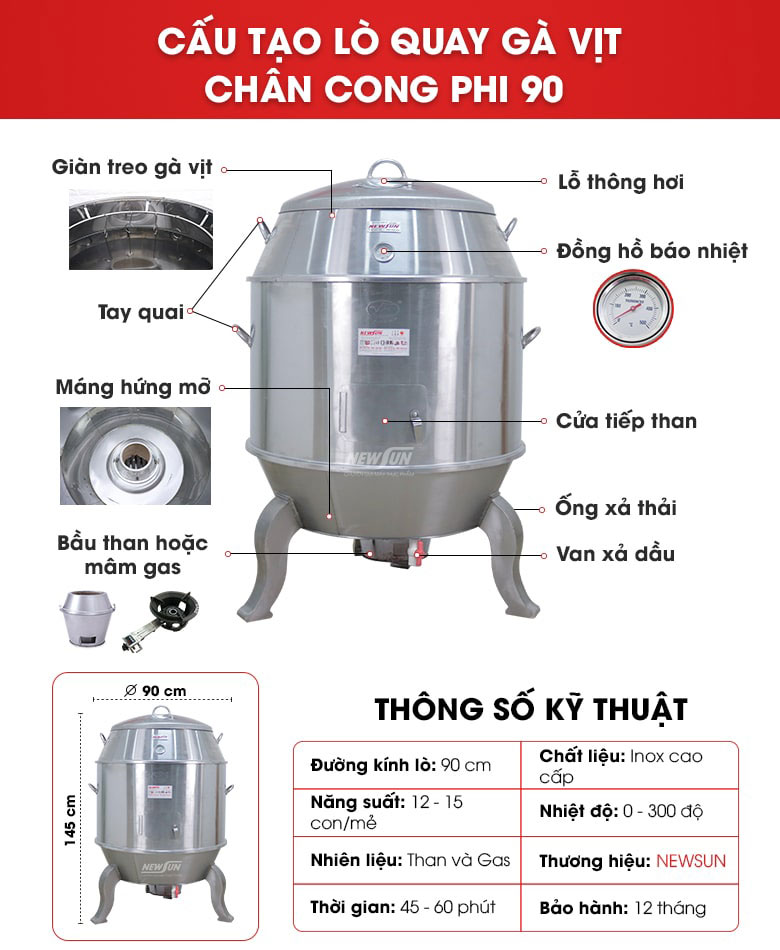 Lò sở hữu đường kính 90cm cho khả năng quay nướng 12-15 con gà vịt tùy khối lượng chỉ trong 45-60 phút. Với mức năng suất này, lò có thể đáp ứng tốt nhu cầu sản lượng của các nhà hàng, quán kinh doanh gà vịt quay quy mô trung bình hiện nay.