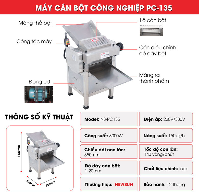 Máy cán bột mì PC-135 là dòng sản phẩm do NEWSUN nhập khẩu và phân phối trực tiếp đến tay khách hàng nên đảm bảo cả về chất lượng lẫn giá thành sản phẩm.