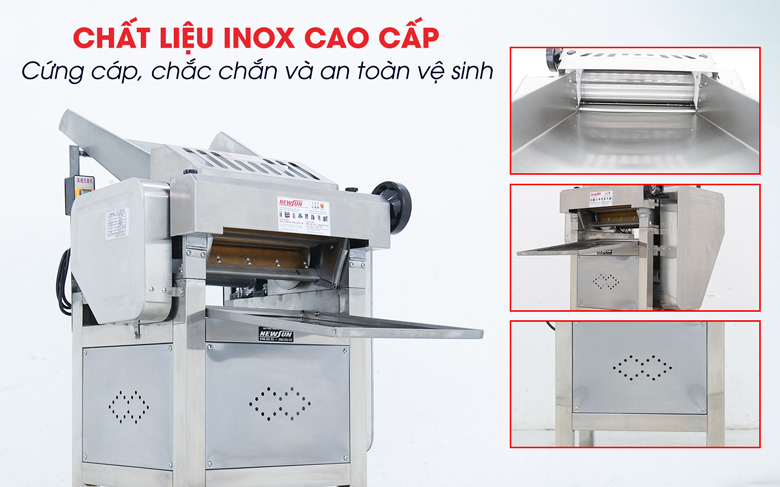 Toàn bộ khung thân vỏ máy, máng thả bột đến hộp chứa dây curoa đều được làm bằng inox cao cấp. Chất liệu có độ cứng và chắc chắn, vừa đảm bảo về độ bền, tính thẩm mĩ, vừa không bị han gỉ, an toàn vệ sinh.
