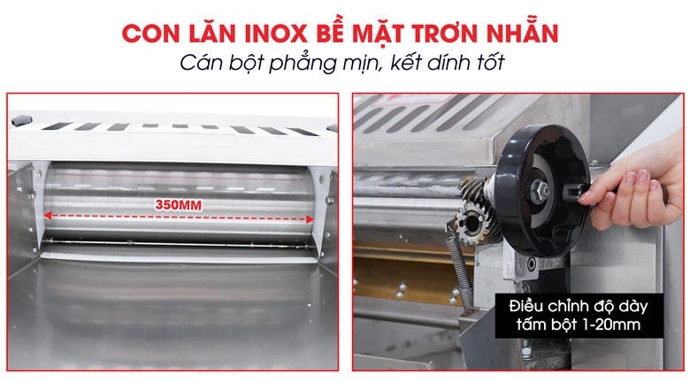 Hơn nữa, khoảng cách giữa 2 con lăn có thể điều chỉnh linh hoạt cho phép người dùng cán bột với các độ dày từ 1-20mm.