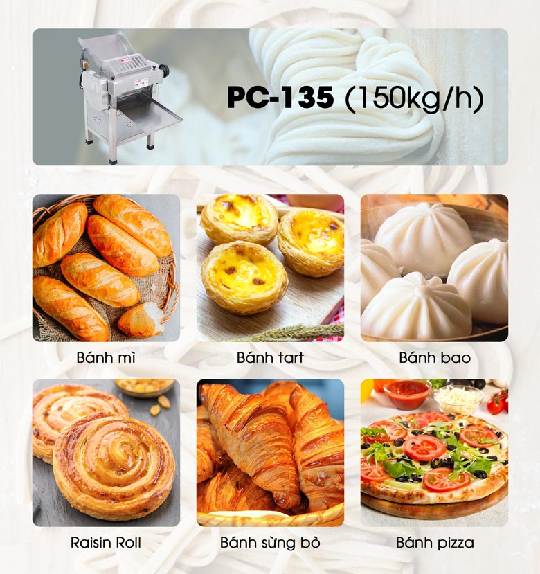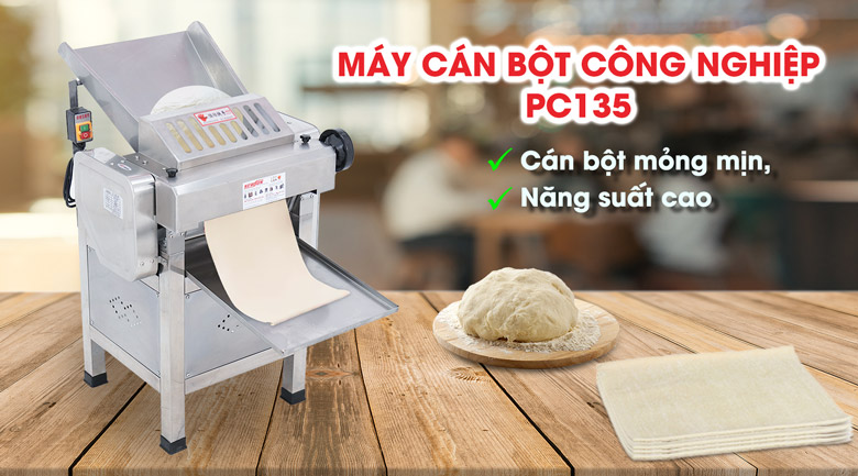 Máy cán bột mì PC-135 là model lớn nhất của dòng máy cán bột công nghiệp PC, có khả năng cán bột phẳng mịn, nhanh chóng với các độ dày chủ động, năng suất lên đến 150kg/giờ. Thiết bị hiện đang rất được ưa chuộng trong các cửa hàng bánh mì, các siêu thị, cơ sở sản xuất kinh doanh bánh quy mô vừa và lớn.