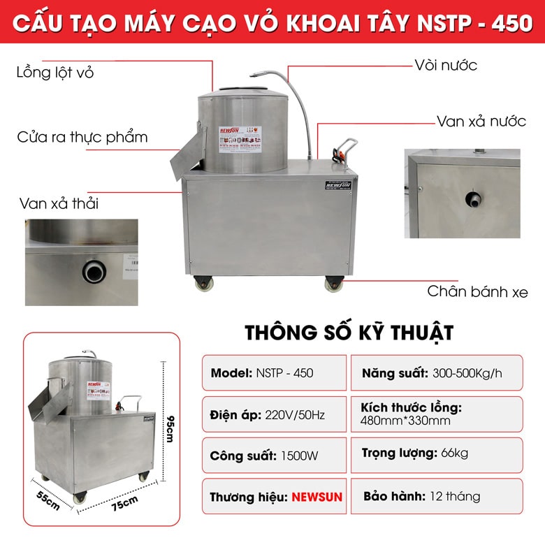 Máy cạo vỏ khoai NSTP-450 với nhiều ưu điểm nổi bật cùng cấu tạo tối ưu sẽ giúp việc gọt vỏ khoai số lượng lớn trở nên đơn giản hơn bao giờ hết.