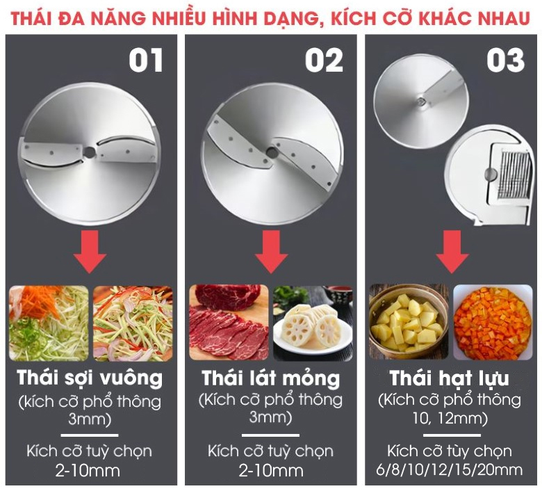 Máy không chỉ linh hoạt trong việc tạo ra nhiều hình dạng thái mà còn có khả năng xử lý hầu hết các loại rau, củ, quả (trừ những loại có hạt cứng), như: cà rốt, su hào, khoai tây, khoai lang, khoai môn, củ măng, củ sen, củ gừng, táo, dưa chuột, lê, cà tím, hành tây, củ dền…