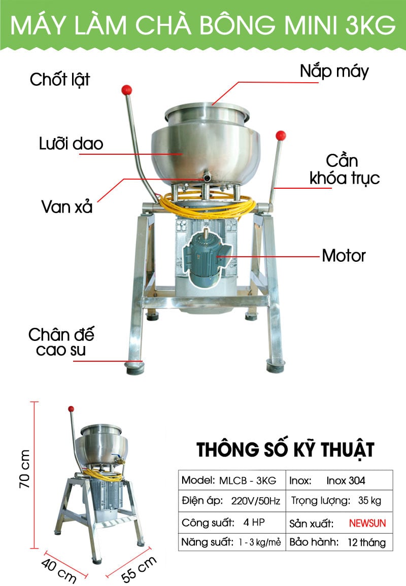 Hiểu được điều này, NEWSUN giới thiệu đến bạn máy đánh chà bông 3kg/mẻ với khả năng đánh bông tới 3kg thịt chỉ trong 3-4 phút, thịt được xé thành sợi nhỏ đều.
