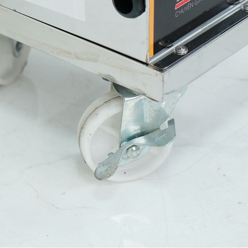 - Bánh xe linh hoạt: Máy được trang bị thêm hệ thống bánh xe dưới chân đế, giúp người dùng dễ dàng di chuyển máy đến nhiều vị trí khác nhau mà không tốn sức. Đây là điểm cộng lớn đối với các cơ sở thường xuyên thay đổi vị trí đặt máy.