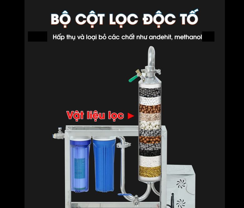 Đây được coi là “trái tim” của máy, bên trong chứa nhiều lớp vật liệu xếp tầng có tác dụng loại bỏ các độc tố nguy hiểm như andehit, methanol, fufurol – những chất gây ra tình trạng đau đầu, chóng mặt, mệt mỏi sau khi uống rượu. Nhờ cột lọc độc tố này, rượu trở nên êm hơn, an toàn hơn và dễ uống hơn.