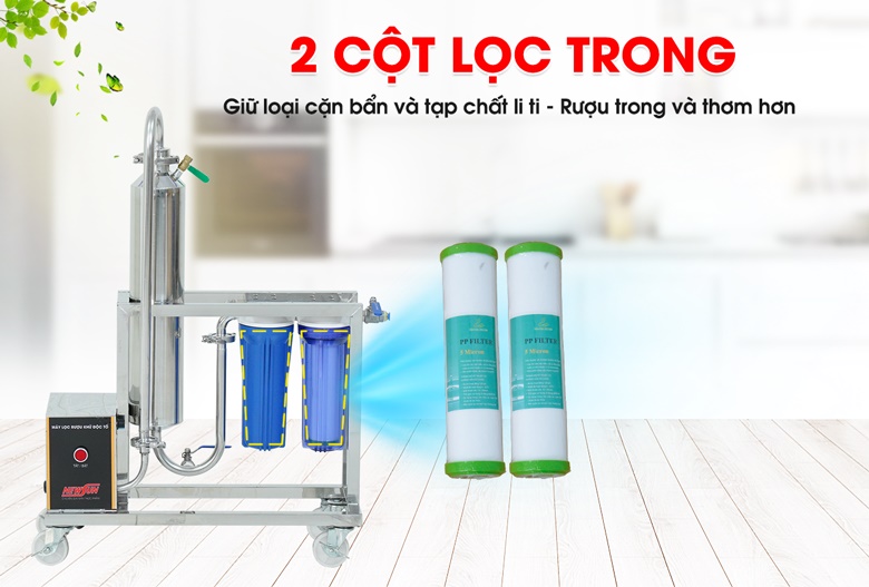 - Sau khi cắm điện, dưới sức hút của động cơ, rượu cần lọc được đưa qua cốc lọc sơ cặn thô, sau đó được đẩy qua ống dẫn rượu đi và hệ thống lọc đa tầng (cột lọc inox). Tại đây, rượu được lọc và loại bỏ các tạp chất độc hại.