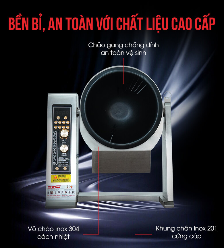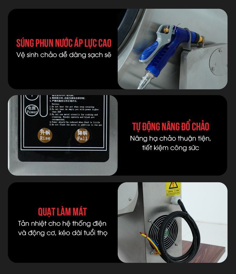 – Tự động nâng đổ chảo: Bạn có thể nâng hạ chảo dễ dàng nhờ nút tự động nâng hạ ở bảng điều khiển, tiết kiệm công sức, thuận tiện cho việc lấy thức ăn ra ngoài.