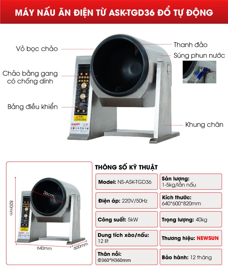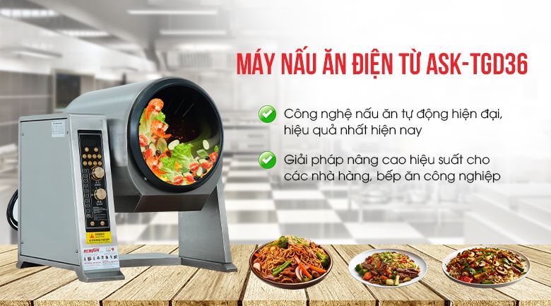 Máy nấu ăn tự động ASK-TGD36 có công suất tối đa 5000W và dung tích chảo lên đến 12 lít, có khả năng xào được từ 1 đến 5kg thực phẩm khoảng 10 phút.