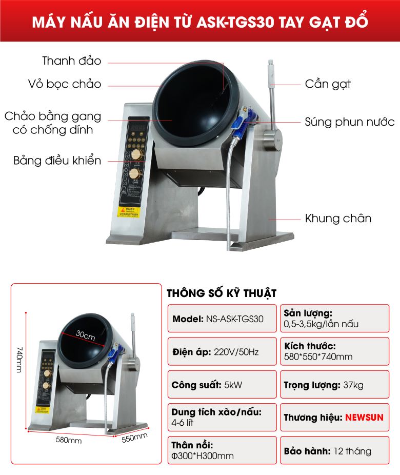 Với công suất tối đa 5000W và dung tích chứa chảo lên tới 4-6 lít, máy nấu ăn tự động ASK-TGS30 có thể nấu được 0,5-3,5kg thức ăn trong 10 phút.