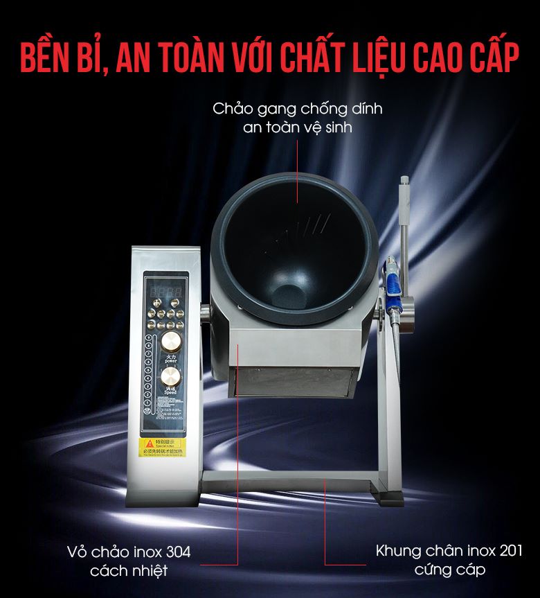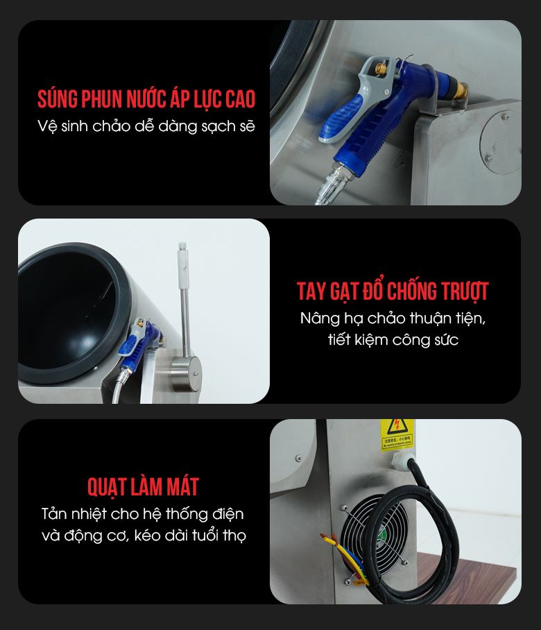 – Tự động nâng đổ chảo: Chỉ cần một nút bấm, chảo sẽ tự động nâng lên, giúp bạn lấy thức ăn ra ngoài một cách dễ dàng và an toàn