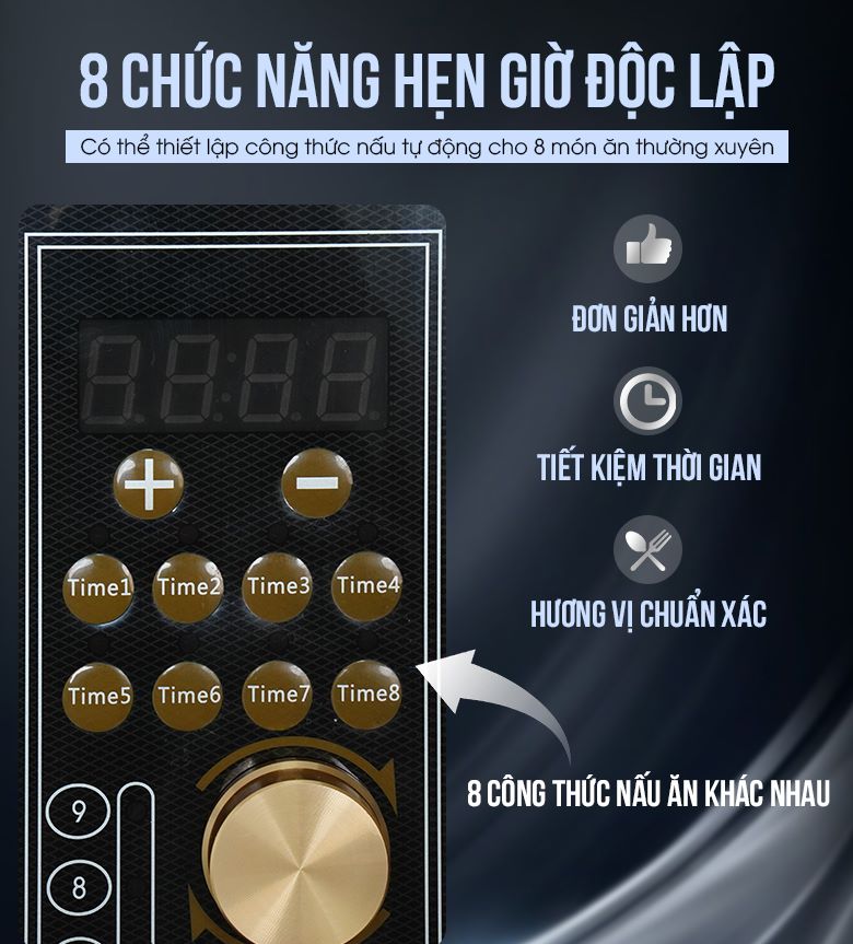 Thiết kế 8 nút thời gian cho phép người dùng thiết lập công thức nấu ăn cho các món thường xuyên nấu. Bạn chỉ cần cài đặt thời gian và công suất nấu cho từng loại món ăn, máy sẽ tự động ghi nhớ và nấu theo các thiết lập này. Nhờ vậy, việc nấu nướng trở nên đơn giản, tiết kiệm thời gian mà vẫn đảm bảo món ăn ổn định, đạt tiêu chuẩn của nhà hàng và bếp ăn công nghiệp.