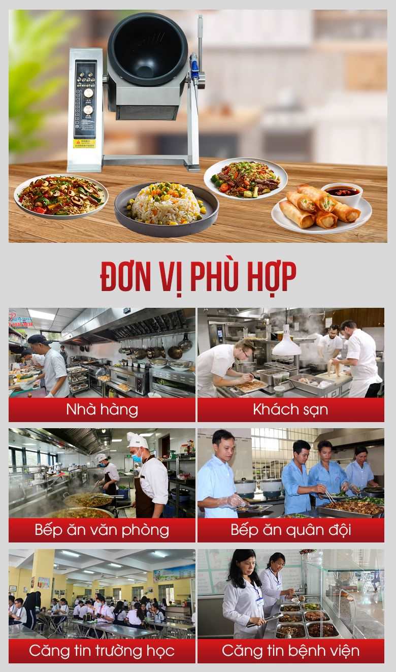Thiết bị này phù hợp cho mọi bếp ăn công nghiệp như nhà hàng, khách sạn, quán ăn nhanh, căng tin trường học, bếp ăn quân đội và các ngành công nghiệp chế biến khác.
