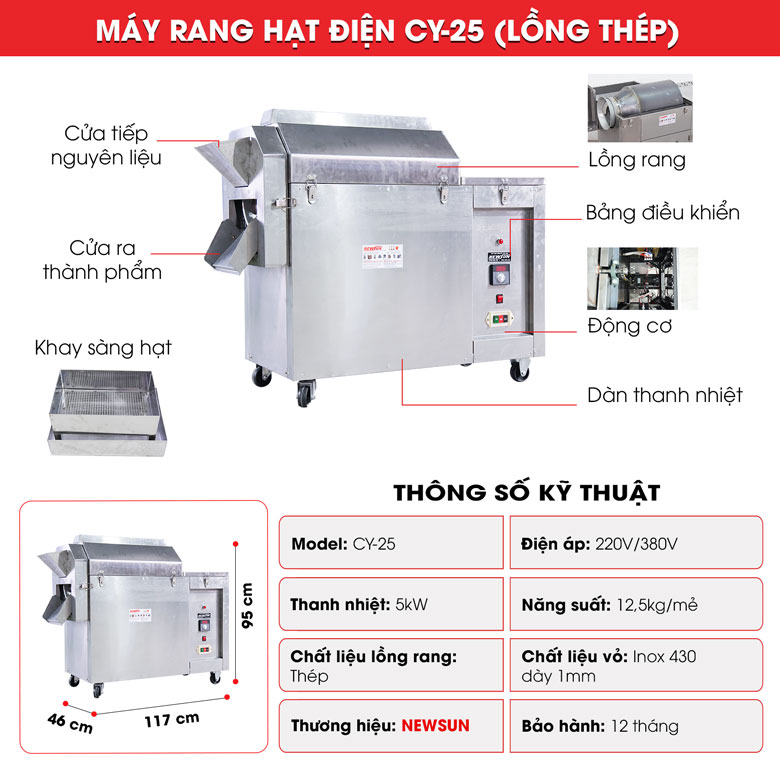 Máy rang hạt CY-25 dùng điện được NEWSUN trực tiếp nhập khẩu và phân phối tới khách hàng, không qua trung gian nên đảm bảo chất lượng và mức giá phù hợp nhất.