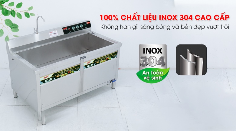 Khác biệt với các dòng máy rửa bát nhập khẩu phổ thông, máy rửa bát siêu âm MRS-1500SS được chế tạo từ inox 304 chất lượng cao. Chất liệu này không chỉ có khả năng chống ăn mòn và chống gỉ sét tốt mà còn dễ dàng vệ sinh sau mỗi lần sử dụng, đảm bảo độ bền vượt trội ngay cả trong môi trường khắc nghiệt của bếp công nghiệp.