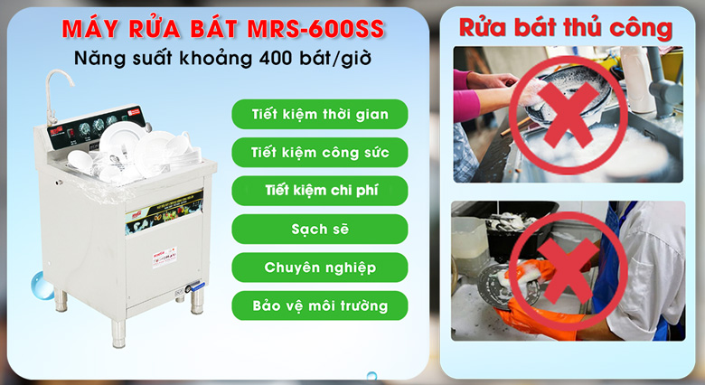 Bên cạnh đó, với máy rửa bát MRS-600SS, chỉ cần một lần thay nước là bạn có thể làm sạch toàn bộ số bát đĩa, hiệu quả và tiết kiệm nước hơn hẳn so với phương pháp rửa thủ công từng chiếc.