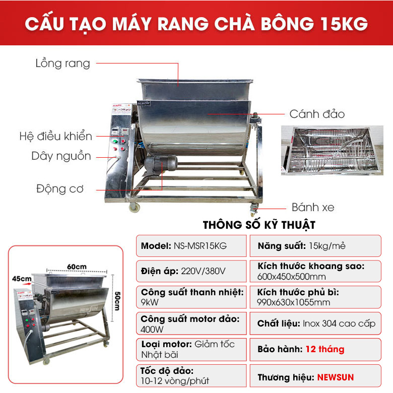 Khi mua máy sao ruốc điện 15kg tại NEWSUN, bạn sẽ được bảo hành 12 tháng phần điện, 6 năm với các mối hàn inox và bảo trì, sửa chữa trọn đời sản phẩm. Đặc biệt, lỗi 1 đổi 1 miễn phí trong 3 ngày đầu tiên nếu phát hiện lỗi từ nhà sản xuất.