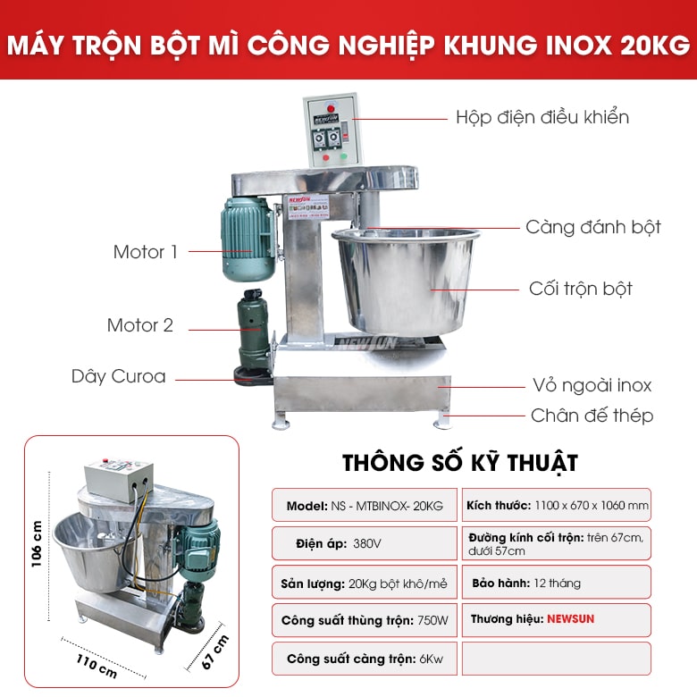 Máy trộn bột mì Việt Nam 20kg/mẻ (khung inox) thuộc dòng máy trộn bột mì công nghiệp Việt Nam do NEWSUN trực tiếp sản xuất và phân phối. Với khả năng nhồi bột nhanh chóng, nhuyễn mịn, kết dính tốt, máy hiện đang rất được người làm bánh ưa chuộng.