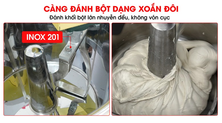 Càng đánh bột của máy được chế tạo từ chất liệu inox 201, có khả năng chịu lực tốt ngay cả khi đánh ở tốc độ cao. Đồng thời, càng này được thiết kế dạng xoắn đôi cùng độ nghiêng chuẩn giúp máy nhồi được cả những khối bột lớn tới 15kg mà vẫn nhuyễn mịn và không bị vón cục.