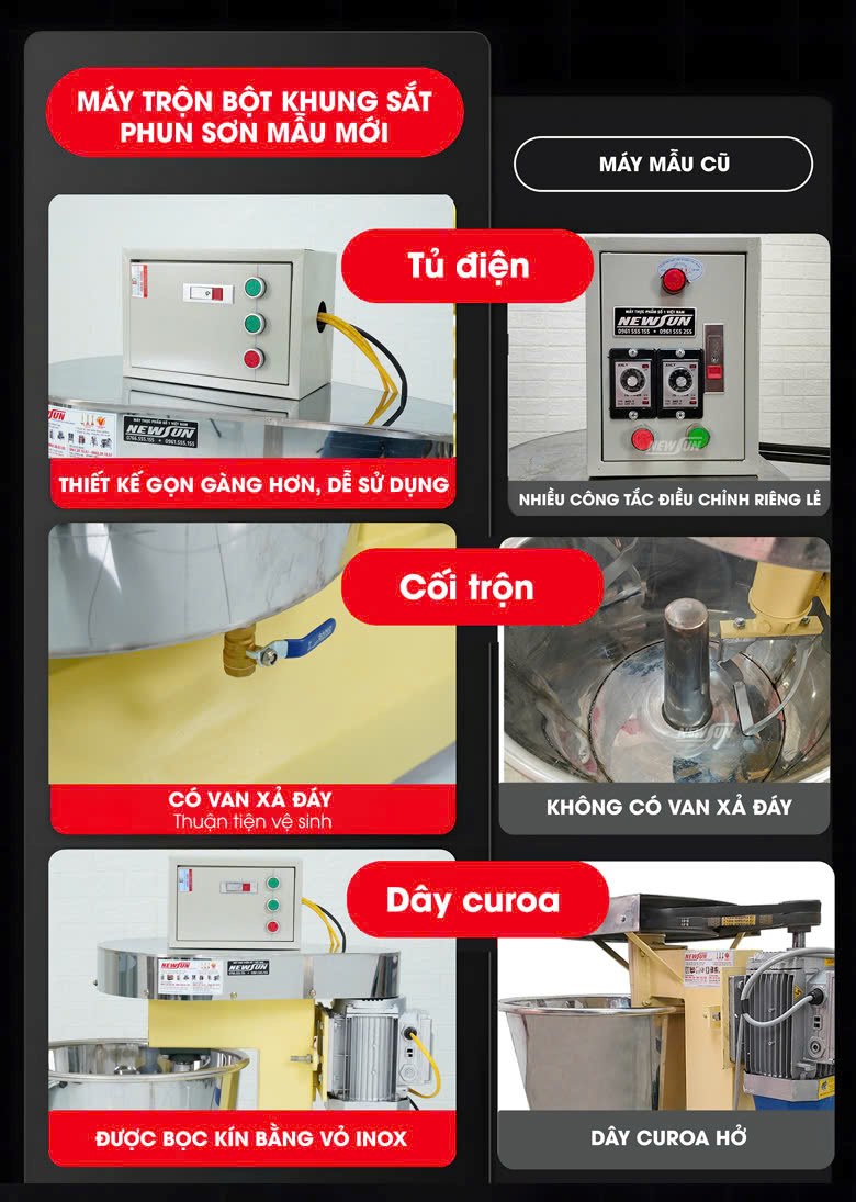 So với phiên bản trước, máy trộn bột mì 7kg khung sắt phun sơn NEWSUN đã có một số cải tiến đáng chú ý: