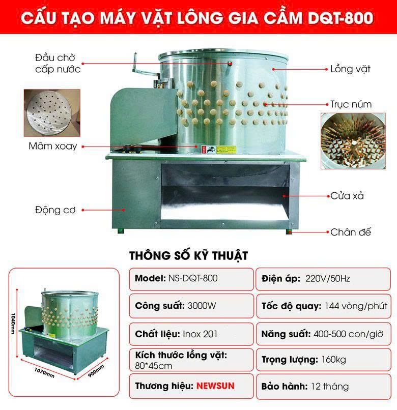 Với những ưu điểm vượt trội như thiết kế cửa mở tiện lợi, trục núm vặt hiện đại, chất liệu inox 201 cao cấp cùng nhiều tính năng hữu ích khác, máy vặt lông gà vịt DQT-800 là lựa chọn hoàn hảo cho các quán ăn, nhà hàng lớn, lò mổ và cơ sở chế biến gia cầm. Máy có khả năng xử lý lên đến 400-500 con mỗi giờ, đáp ứng nhu cầu làm lông gia cầm lớn hơn 100 con mỗi ngày.