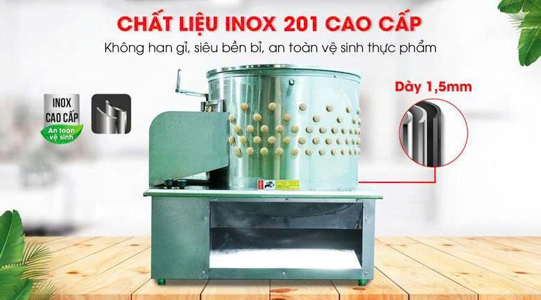 Máy vặt lông gà vịt DQT-800 sử dụng chất liệu inox 201 cao cấp với độ dày 1,5mm cho toàn bộ khung vỏ máy, lồng vặt, mâm xoay và trục núm, mang đến độ bền vượt trội và khả năng chống han gỉ tốt ngay cả khi tiếp xúc với nước thường xuyên, đảm bảo tiêu chuẩn vệ sinh thực phẩm. Phần mâm xoay bằng inox 201 dày dặn không xảy ra tình trạng mòn rách mâm chỉ sau 1-2 năm sử dụng như các loại máy vặt giá rẻ làm mâm inox mỏng trên thị trường.