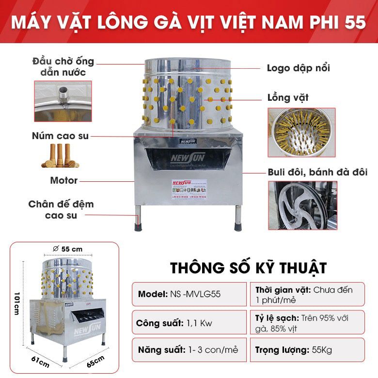 Máy vặt lông gà vịt Việt Nam phi 55cm là sản phẩm thuộc dòng máy vặt lông gà vịt cao cấp do NEWSUN trực tiếp sản xuất và phân phối. Với khả năng vặt sạch lông gia cầm nhanh chóng, năng suất cao vượt trội, thiết bị này hiện đang là trợ thủ đắc lực không thể thiếu trong nhiều lò giết mổ gia cầm, các quán ăn, nhà hàng,…