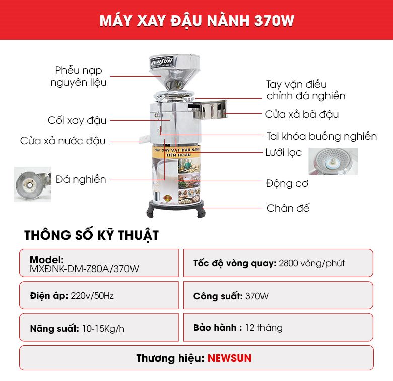- Máy xay đậu nành 370W (10-15kg/giờ) là sản phẩm được NEWSUN nhập khẩu và phân phối trực tiếp đến tay khách hàng không qua trung gian nên hoàn toàn được đảm bảo về chất lượng, giá thành.