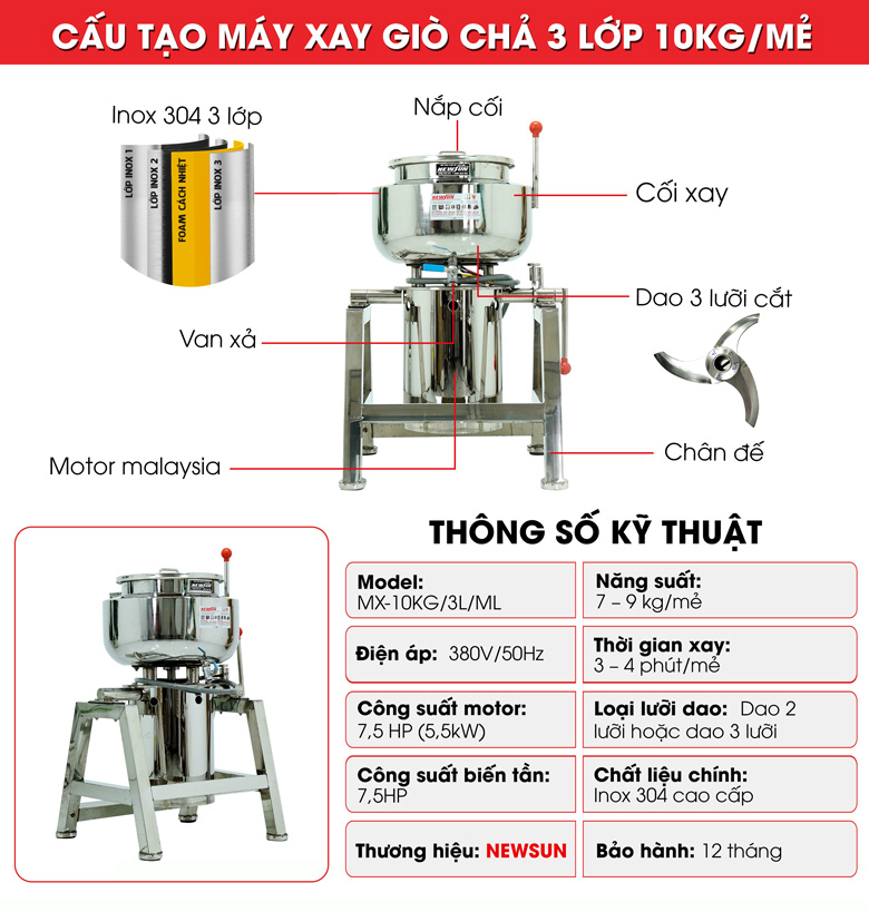Ưu điểm và tính năng vượt trội của máy xay giò chả 3 lớp 10kg/mẻ NEWSUN