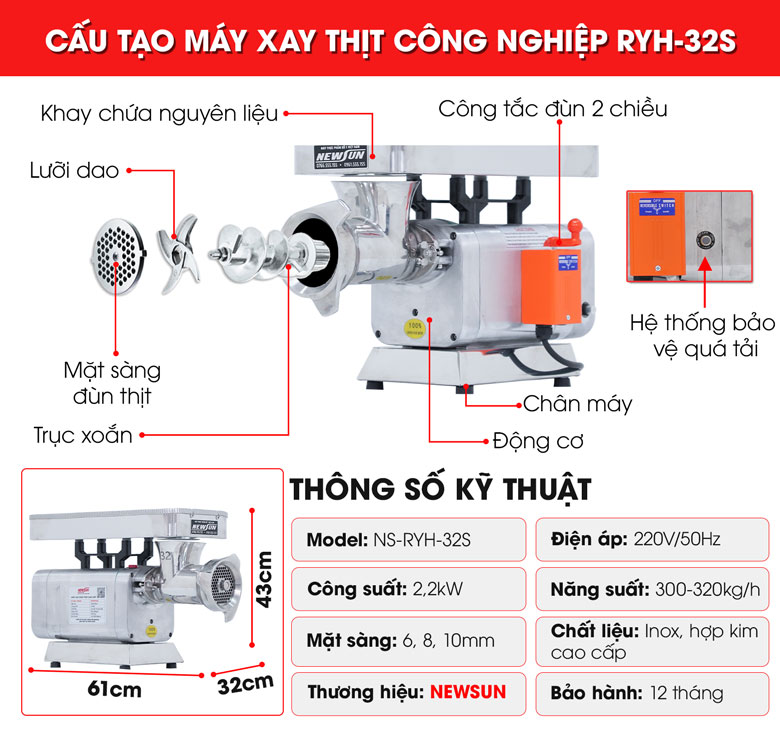 Máy xay thịt công nghiệp RYH-32S phiên bản cao cấp mới được NEWSUN nhập khẩu chính hãng và phân phối trực tiếp không qua trung gian nên chất lượng và giá thành vô cùng đảm bảo. Giá tốt, không bị đội cao như nhiều đơn vị khác.