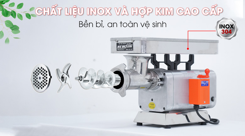 Toàn bộ máy xay đùn thịt RYH-32S đều được làm từ chất liệu inox và hợp kim cao cấp, không bị han gỉ khi tiếp xúc nhiều với muối, nước và thực phẩm, đảm bảo an toàn vệ sinh tuyệt đối. Tuy nhiên, sau mỗi lần sử dụng máy xong, bạn cần tháo rời các bộ phận xay thịt để vệ sinh sạch sẽ, tránh để kẹt vụn thịt, đảm bảo tuổi thọ lâu dài cho máy.