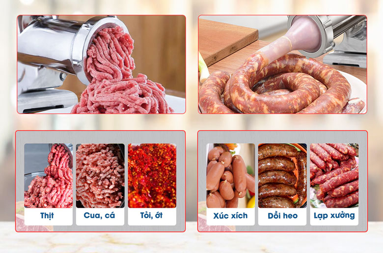 Ngoài dùng để xay các loại thịt mỡ tươi sống, máy còn xay được thịt đông lạnh và một số loại thịt có lẫn da, gân, sụn mềm mà không xảy ra tình trạng kẹt nguyên liệu trong máy.