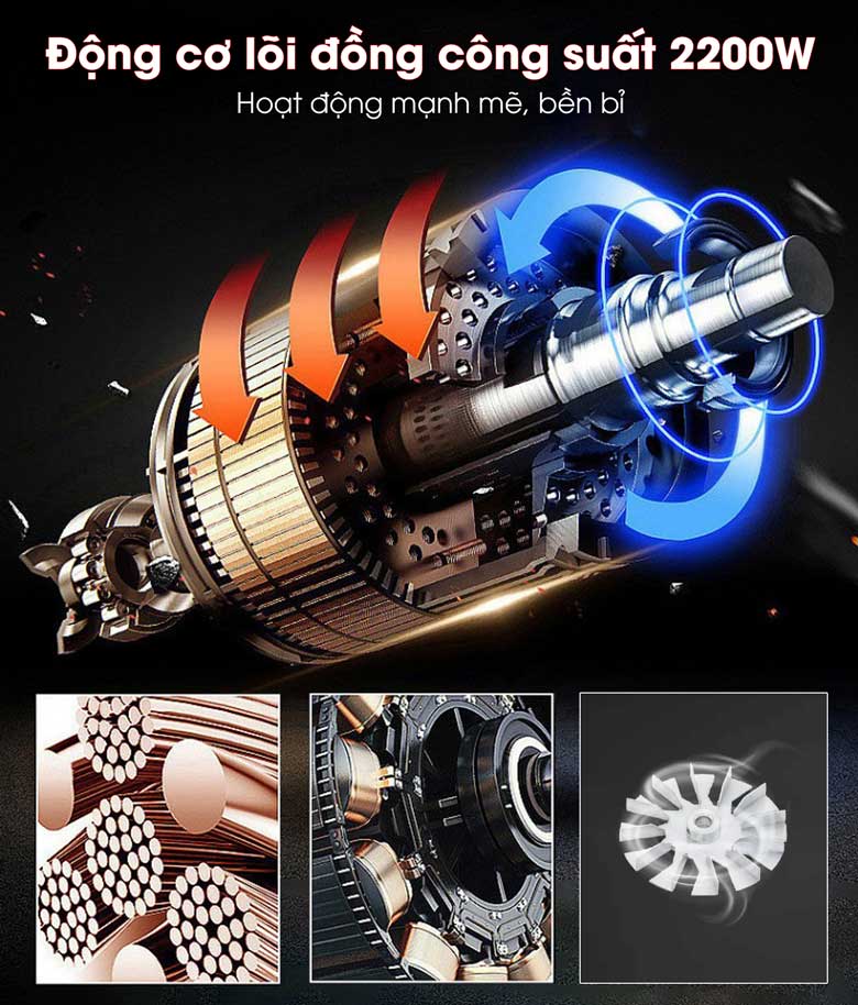 Đặc biệt hơn, bên trong động cơ còn được trang bị thêm quạt tản nhiệt để làm mát, đảm bảo động cơ bền bỉ lâu dài cũng như duy trì thời gian chạy lâu hơn các loại máy không có quạt, tản nhiệt kém.