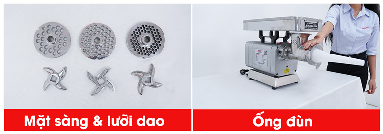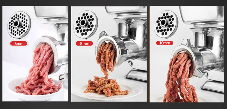 Máy trang bị 3 đầu đùn với các kích cỡ (đường kính lỗ đùn) 6mm, 8mm và 10mm. Do đó có thể xay thịt với nhiều độ nhuyễn khác nhau chỉ cần thay mặt sàng phù hợp, đáp ứng nhiều nhu cầu chế biến.