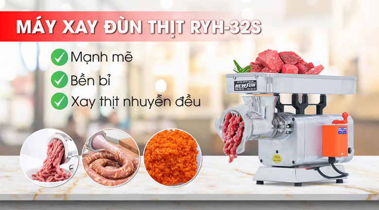 Máy xay thịt công nghiệp RYH-32S là dòng máy xay đùn thịt cao cấp mới của NEWSUN với nhiều điểm cải tiến ưu việt, cho năng suất và hiệu quả sử dụng cao hơn gấp nhiều lần dòng RY-32 cũ. Song giá bán lại không chênh lệch quá nhiều. Thiết bị rất phù hợp dùng trong các nhà hàng, siêu thị, bếp ăn tập thể hay các cơ sở chế biến thịt, thực phẩm quy mô trung bình.