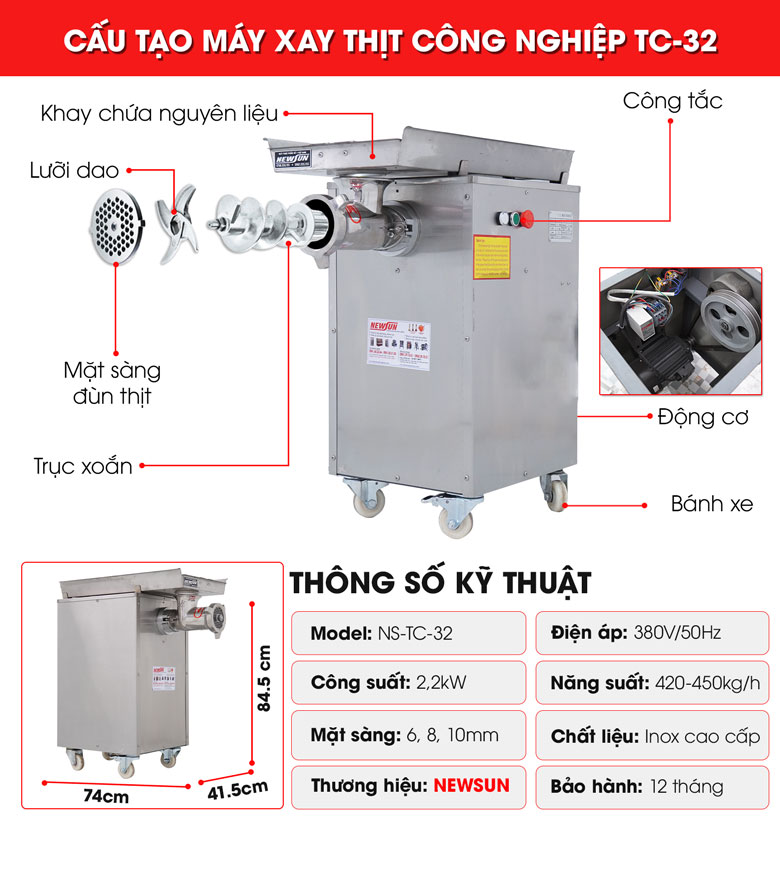 Máy xay thịt công nghiệp TC-32 phiên bản cao cấp mới được NEWSUN nhập khẩu chính hãng và phân phối trực tiếp không qua trung gian nên chất lượng và giá thành vô cùng đảm bảo. Giá tốt, không bị đội cao như nhiều đơn vị khác. Kèm theo đó là chính sách bảo hành uy tín: 12 tháng phần điện, 3-6 năm phần inox và bảo trì trọn đời sử dụng sản phẩm.