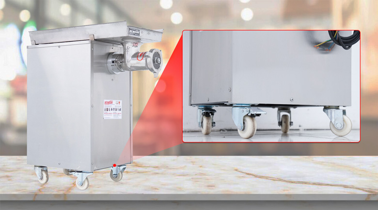 Mặc dù thuộc dòng công nghiệp nhưng máy xay đùn thịt TC-32 có thiết kế khá gọn gàng, cao vừa tầm sử dụng. Phía dưới chân máy trang bị 4 bánh xe nhỏ để thuận tiện di chuyển trong khu vực bếp. Khi cần cố định vị trí có thể khóa chốt 2 bánh trước lại.
