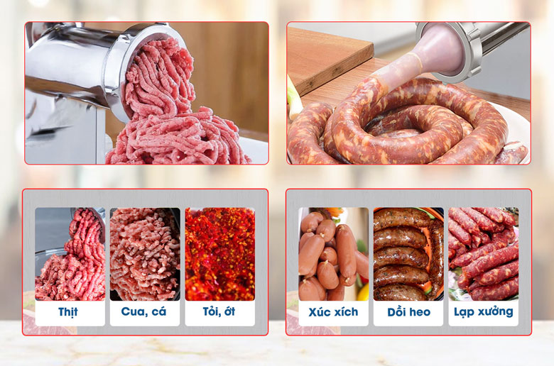 Bên cạnh chức năng chính là xay thịt, TC-32 còn có thể xay đa năng nhiều loại thực phẩm như tôm, cua, cá, xay hải sản, rau củ, gia vị,… hoặc dùng để đùn lạp xưởng, xúc xích, lòng dồi khi lắp thêm ống đùn.