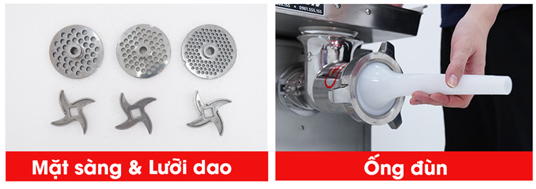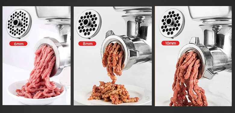 Máy trang bị 3 đầu đùn với các lỗ đùn đường kính 6mm, 8mm và 10mm. Do đó, máy có thể xay thịt với nhiều độ nhuyễn khác nhau, tương ứng với loại mặt sàng sử dụng, phục vụ nhiều nhu cầu chế biến.