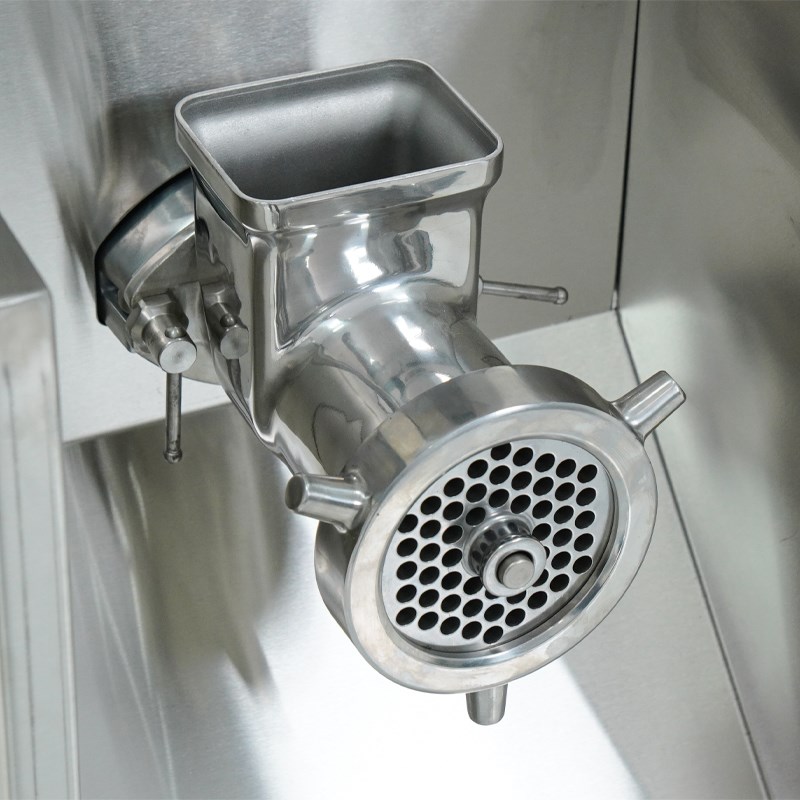 Đặc biệt, máy TJ-II-35 được trang bị 2 loại mặt sàng kích cỡ 6mm và 8mm, có thể dễ dàng thay thế để phù hợp với từng yêu cầu xay nhuyễn khác nhau. Các bộ phận tiếp xúc trực tiếp với thực phẩm như khay chứa nguyên liệu, cổ máy, lưỡi dao, trục xoắn, máng hứng inox cũng có thể tháo rời để vệ sinh sạch sẽ.